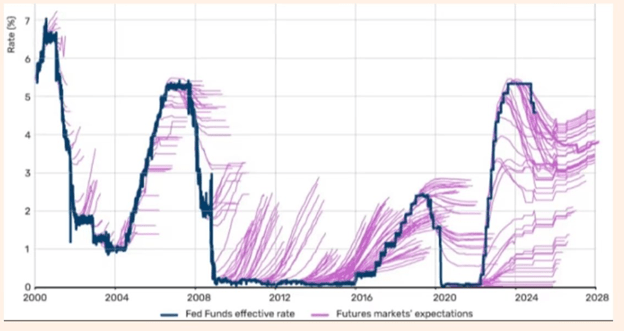 Below is a graph that shows the actual federal funds rate over the past 25 years (dark blue line) and it also shows the forecasted federal funds rate for a 1-3 year period throughout the past 25 years (purple lines). What is clearly evident in this graph is how wrong the forecast is for the federal funds rate versus the actual changes to the federal funds rate. Two periods that are particularly bad with the forecast is in the 2010s when the market kept expecting the rate to increase over a 7 year period and it remained flat. Another time was in 2021& 2022 when the market was forecasting a very slow increase in rates while in reality the federal reserve rates increased by 500bps in 18 months.