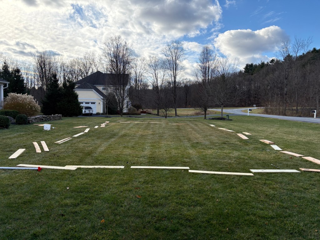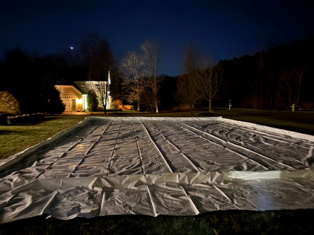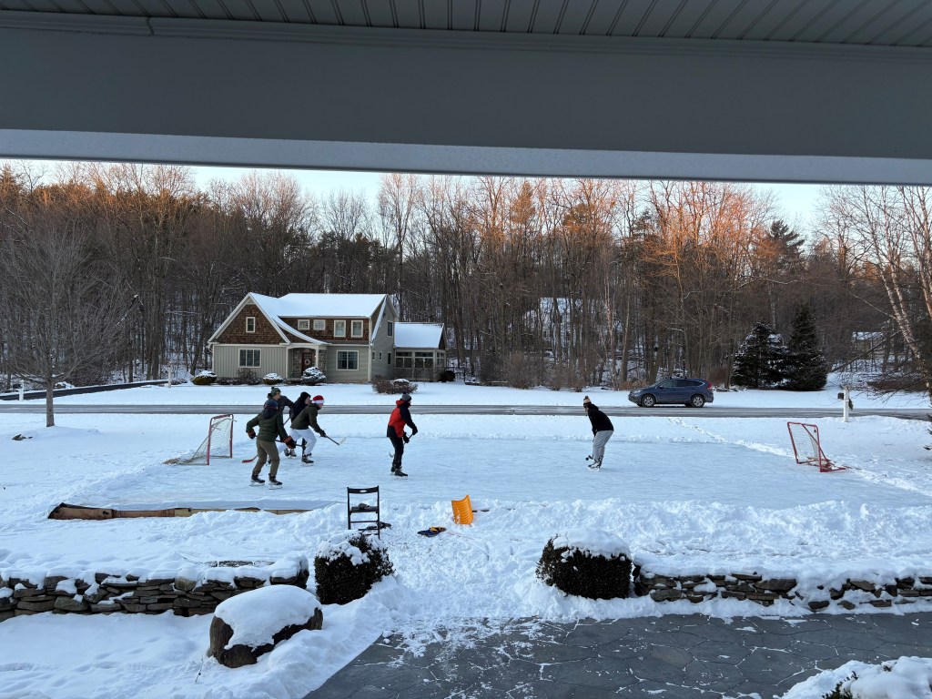 For the past 6 years I have worked with my three teenagers to build an ice rink in our front yard. This basically entails setting up a 35’ by 55’ wooden framework, covering it with one very large plastic tarp and then letting the hose run for way too long (the deep end of the rink has 12 inches of water, ice or some combination).
