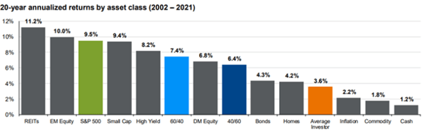 The graph below is a great illustration of the challenges facing individual investors. For the 20 years from 2002 to 2021 the annualized return for the average investor is 3.6%. Compare this to the 6.4% annualized return of a portfolio with 60% bonds and 40% stocks and you can see that the average investor consistently makes investment decisions that negatively impact their portfolio performance.