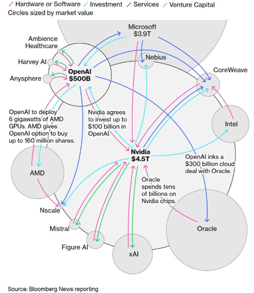 Now let’s exam the areas of concerns I have to start first with the graph below that shows how all the AI/tech companies are so intertwined with both investing in each other and revenue coming from each other. This is similar to my story about telecom companies not only buying from each other but also financing the purchases. This circular nature of an industry is never a great sign.
