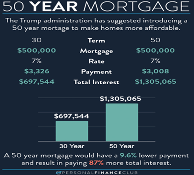 One solution that was recently proposed by the administration is to begin offering a 50-year mortgage. As the graphic below shows, this solution does lower the cost of a monthly payment by approximately 10% but it also increases the amount of interest paid over the life of the mortgage by 87%! One of the great benefits of a 30-year mortgage is that an individual can purchase a home when they are 30 and by the time they are ready to retire, they will have the mortgage fully paid. With a 50-year mortgage, there is a good chance they will never have their mortgage paid off. This solution does not fix the problem but merely provides a band aid that may cause more problems. One of these additional problems is that buyers will likely start raising their price offers on houses and it is possible that prices may rise enough to offset much of the benefit of the 30-year mortgage. From a societal perspective, it will simply increase the size of mortgage loans on everyone’s net-worth statement.